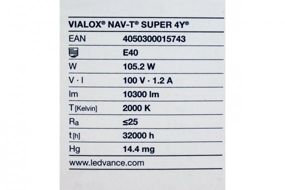 Технические характеристики Osram NAV-T 100W, SUPER 4Y, E40, 12X1 4050300015743