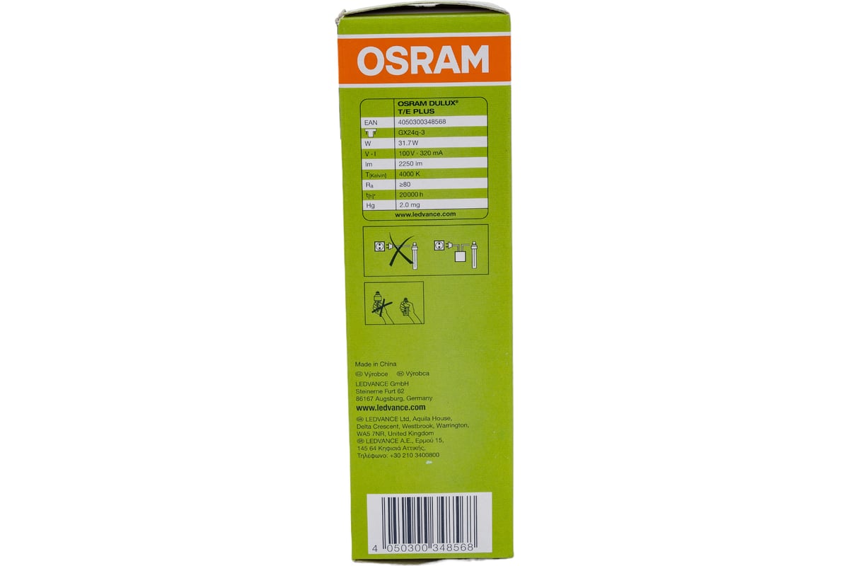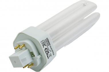 Компактная люминесцентная лампа неинтегрированная OSRAM DULUX T/E PLUS мощностью 13Вт со штырьковым одиночным четырехконтактным цоколем GX24Q с укороченным корпусом и трехоборотными колбами. Короткая и компактная версия.