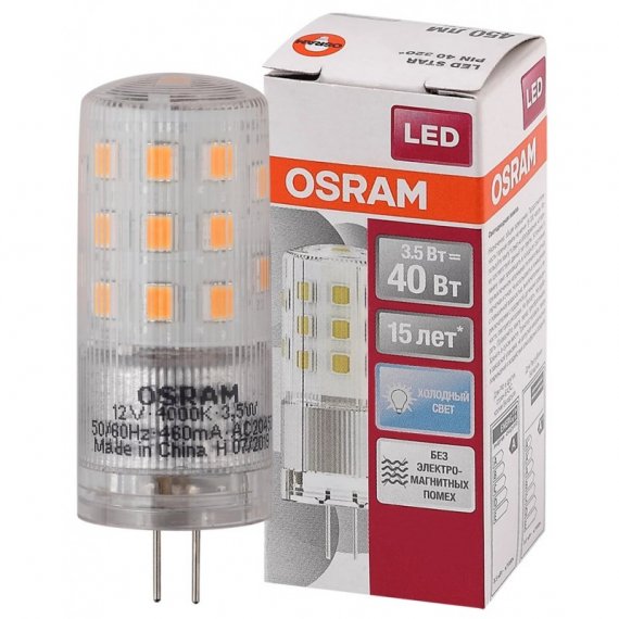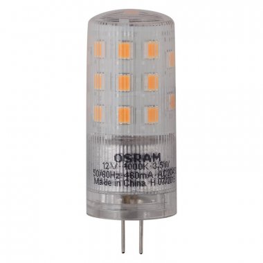 Лампа светодиодная OSRAM LED Star PIN, 450лм, 3,5Вт (замена 40Вт), 4000К (нейтральный белый свет). Цоколь G4, колба PIN, угол пучка 320°. Исполнение колбы прозрачное, пластик. Напряжение питания 12В.