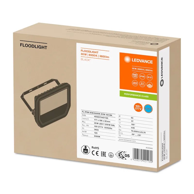 Светодиодный прожектор LEDVANCE PFM 30W/6500K BLACK IP65 3600Лм - это надежное и экономичное решение для освещения. Он обладает мощностью 30 Вт, цветовой температурой 6500 К и световым потоком 3600 лм. Благодаря степени защиты IP65, прожектор может использоваться как внутри помещений, так и на открытом воздухе. Черный корпус придает ему стильный вид.