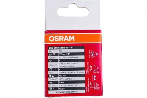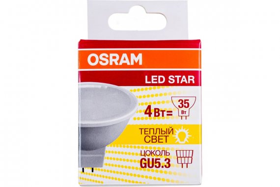 Преимущества Osram STAR LED , MR16, 4Вт, GU5.3, 300 Лм, 3000 К, теплый белый свет 4058075480407