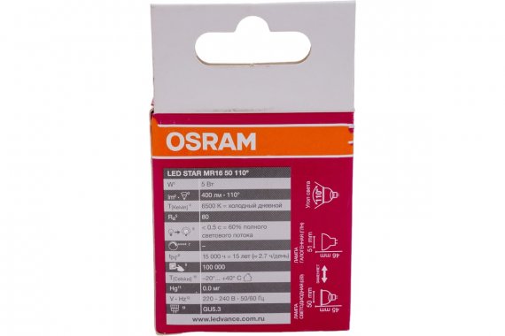 Технические характеристики Osram STAR LED MR16 5Вт GU5.3 400 Лм 6500 К Холодный белый свет 4058075480520