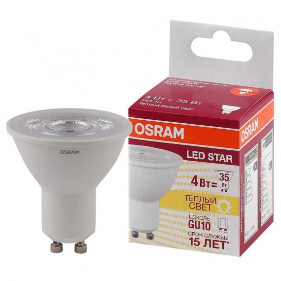 Лампа светодиодная OSRAM LED Star PAR16, 265 лм, 4Вт (замена 35Вт), 3000K (теплый белый свет). Цоколь GU10, колба PAR16, угол пучка 36°. Исполнение колбы прозрачное, пластик. Напряжение питания 220-240В.