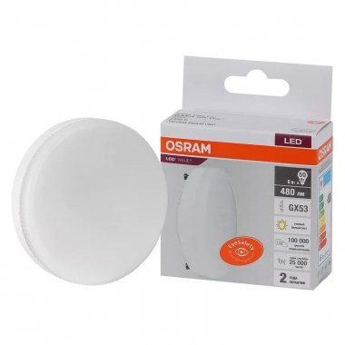 Лампа светодиодная OSRAM LED Value GX, 480лм, 6Вт (замена 50Вт), 3000К (теплый белый свет). Цоколь GX53, колба GX, угол пучка 110°. Исполнение колбы матовое, пластик. Напряжение питания 220-240В.
