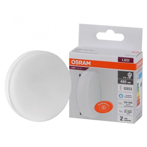 Лампа светодиодная OSRAM LED Value GX, 480лм, 6Вт (замена 50Вт), 6500К (холодный белый свет). Цоколь GX53, колба GX, угол пучка 110°. Исполнение колбы матовое, пластик. Напряжение питания 220-240В.