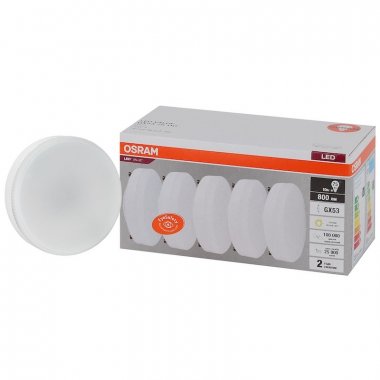 Лампа светодиодная OSRAM LED Value GX53, 800лм, 10Вт (замена 75Вт), 3000К (теплый белый свет). Цоколь GX53, колба GX53. Исполнение колбы матовое, пластик. Напряжение питания 220…240В.