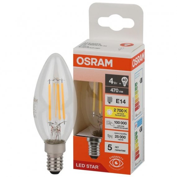 Лампа светодиодная филаментная OSRAM LED Star, 470лм, 4Вт (замена 40Вт), 2700К (теплый белый свет). Цоколь E14, колба B, угол пучка 300°. Исполнение колбы прозрачное, стекло. Напряжение питания 220-240В.