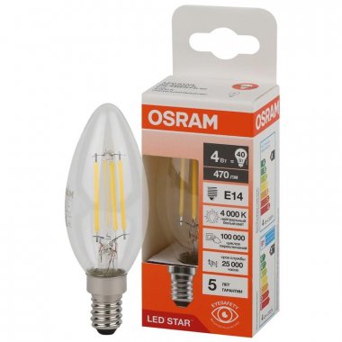 Лампа светодиодная филаментная OSRAM LED Star, 470лм, 4Вт (замена 40Вт), 4000К (нейтральный белый свет). Цоколь E14, колба B, угол пучка 300°. Исполнение колбы прозрачное, стекло. Напряжение питания 220-240В.
