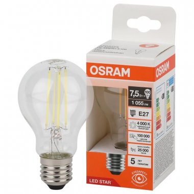 Лампа светодиодная филаментная OSRAM LED Star, 1055лм, 7,5Вт (замена 100Вт), 4000К (нейтральный белый свет). Цоколь E27, колба A, угол пучка 300°. Исполнение колбы прозрачное, стекло. Напряжение питания 220-240В.