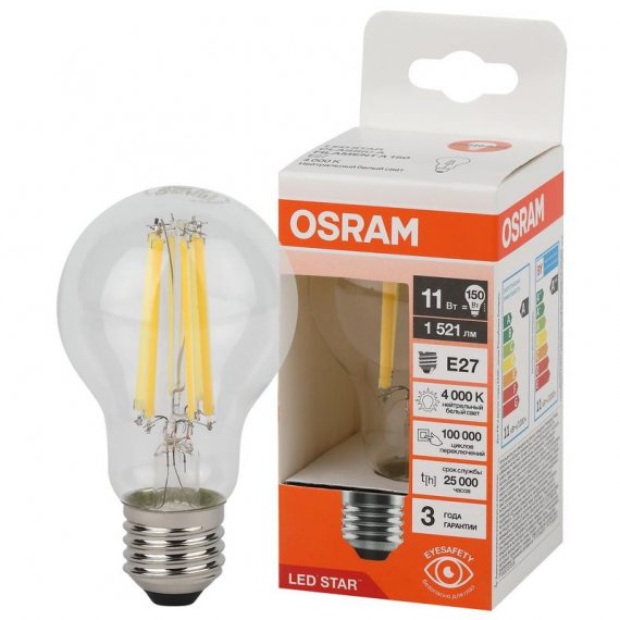Лампа светодиодная филаментная OSRAM LED Star, 1521лм, 11Вт (замена 150Вт), 4000К (нейтральный белый свет). Цоколь E27, колба A, угол пучка 300°. Исполнение колбы прозрачное, стекло. Напряжение питания 220-240В.