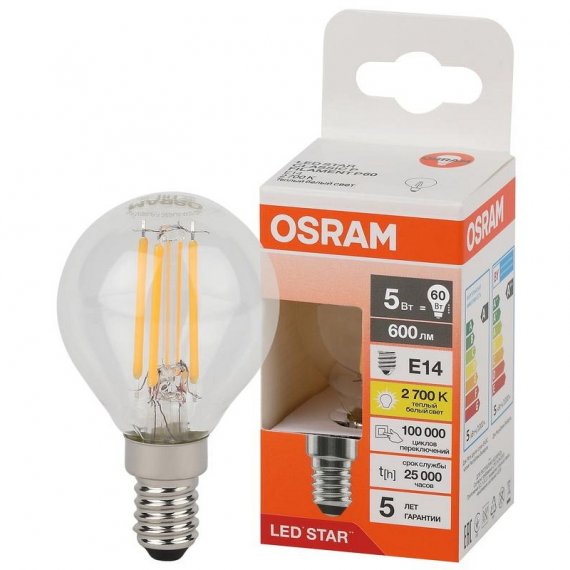 Лампа светодиодная филаментная OSRAM LED Star, 600лм, 5Вт (замена 60Вт), 2700К (теплый белый свет). Цоколь E14, колба P, угол пучка 300°. Исполнение колбы прозрачное, стекло. Напряжение питания 220-240В.