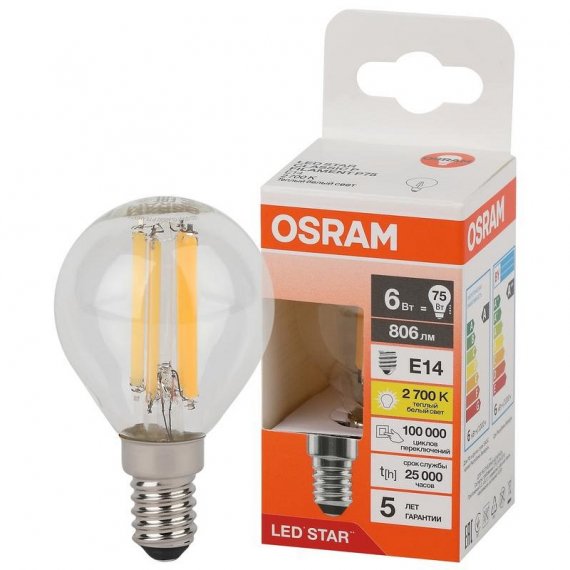 Лампа светодиодная филаментная OSRAM LED Star, 806лм, 6Вт (замена 75Вт), 2700К (теплый белый свет). Цоколь E14, колба P, угол пучка 300°. Исполнение колбы прозрачное, стекло. Напряжение питания 220-240В.