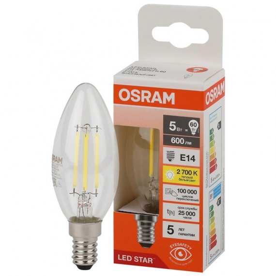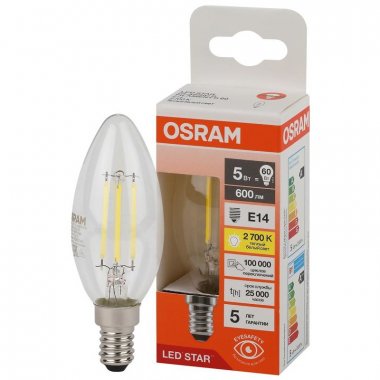 Лампа светодиодная филаментная OSRAM LED Star, 600лм, 5Вт (замена 60Вт), 2700К (теплый белый свет). Цоколь E14, колба B, угол пучка 300°. Исполнение колбы прозрачное, стекло. Напряжение питания 220-240В.