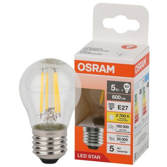 Лампа светодиодная филаментная OSRAM LED Star, 600лм, 5Вт (замена 60Вт), 2700К (теплый белый свет). Цоколь E27, колба P, угол пучка 300°. Исполнение колбы прозрачное, стекло. Напряжение питания 220-240В.