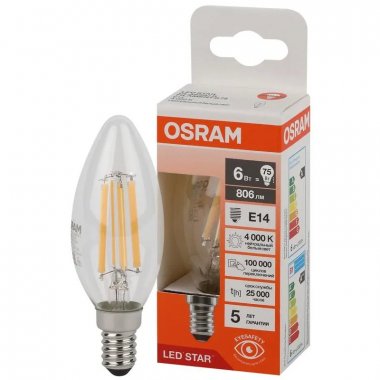 Лампа филаментная светодиодная OSRAM LED Star B, 806лм, 6Вт (замена 75Вт), 4000К (нейтральный белый свет). Цоколь E14, колба B, угол пучка 300°. Исполнение колбы прозрачное, стекло. Напряжение питания 220-240В.