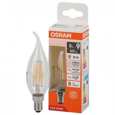 Лампа светодиодная филаментная OSRAM LED Star, 600лм, 5Вт (замена 60Вт), 4000К (нейтральный белый свет). Цоколь E14, колба BA, угол пучка 300°. Исполнение колбы прозрачное, стекло. Напряжение питания 220-240В.