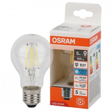 Лампа светодиодная филаментная OSRAM LED Star, 600лм, 5Вт (замена 60Вт), 6500К (холодный белый свет). Цоколь E27, колба A, угол пучка 300°. Исполнение колбы прозрачное, стекло. Напряжение питания 220-240В.