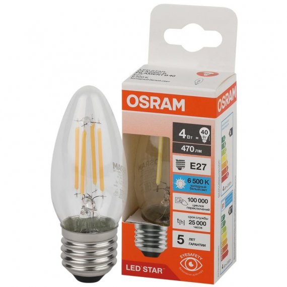 Лампа светодиодная филаментная OSRAM LED Star, 470лм, 4Вт (замена 40Вт), 6500К (холодный белый свет). Цоколь E27, колба B, угол пучка 300°. Исполнение колбы прозрачное, стекло. Напряжение питания 220-240В.