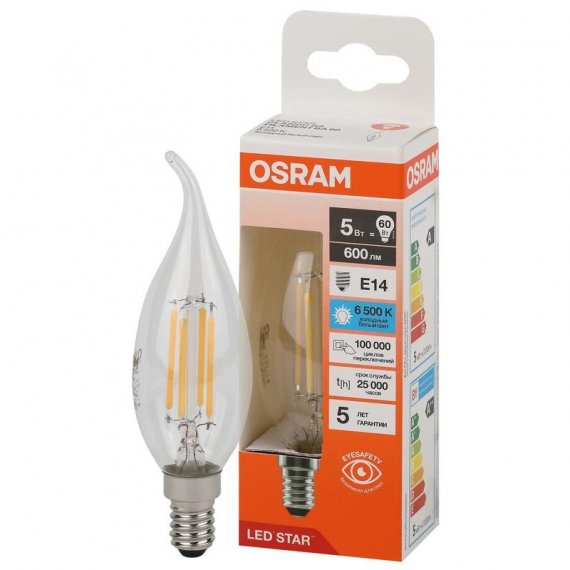 Лампа светодиодная филаментная OSRAM LED Star, 600лм, 5Вт (замена 60Вт), 6500К (холодный белый свет). Цоколь E14, колба BA, угол пучка 300°. Исполнение колбы прозрачное, стекло. Напряжение питания 220-240В.
