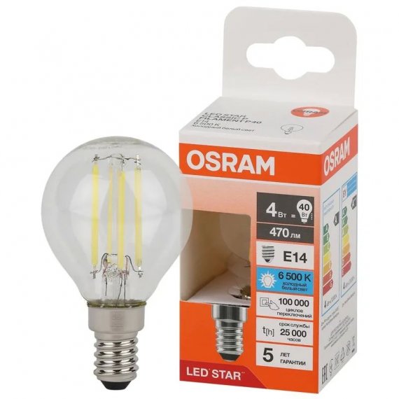 Лампа светодиодная филаментная OSRAM LED Star, 470лм, 4Вт (замена 40Вт), 6500К (холодный белый свет). Цоколь E14, колба P, угол пучка 300°. Исполнение колбы прозрачное, стекло. Напряжение питания 220-240В.