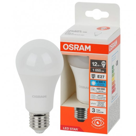 Лампа светодиодная OSRAM LED Star, 1055лм, 12Вт (замена 100Вт), 6500К (холодный белый свет). Цоколь E27, колба A, угол пучка 180°. Исполнение колбы матовое, пластик. Напряжение питания 170-250В.
