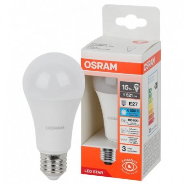 Лампа светодиодная OSRAM LED Star, 1521лм, 15Вт (замена 150Вт), 6500К (холодный белый свет). Цоколь E27, колба A, угол пучка 180°. Исполнение колбы матовое, пластик. Напряжение питания 170-250В.