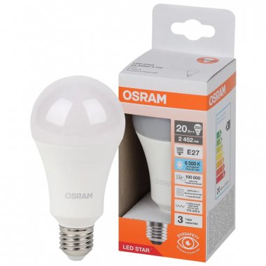 Лампа светодиодная OSRAM LED Star, 2452лм, 20Вт (замена 250Вт), 6500К (холодный белый свет). Цоколь E27, колба A, угол пучка 180°. Исполнение колбы матовое, пластик. Напряжение питания 170-250В.