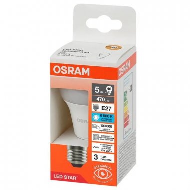 Лампа светодиодная OSRAM LED Star, 470лм, 5Вт (замена 40Вт), 6500К (холодный белый свет). Цоколь E27, колба A, угол пучка 180°. Исполнение колбы матовое, пластик. Напряжение питания 170-250В.
