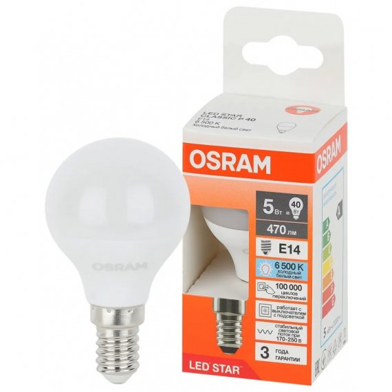 Лампа светодиодная OSRAM LED Star, 470лм, 5Вт (замена 40Вт), 6500К (холодный белый свет). Цоколь E14, колба P, угол пучка 180°. Исполнение колбы матовое, пластик.