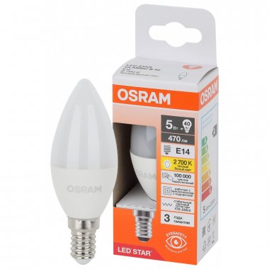 Лампа светодиодная OSRAM LED Star, 470лм, 5Вт (замена 40Вт), 2700К (теплый белый свет). Цоколь E14, колба B, угол пучка 200°. Исполнение колбы матовое, пластик. Напряжение питания 170-250В