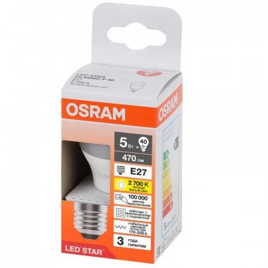 Лампа светодиодная OSRAM LED Star, 470лм, 5Вт (замена 40Вт), 2700К (теплый белый свет). Цоколь E27, колба P, угол пучка 180°. Исполнение колбы матовое, пластик.