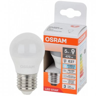 Лампа светодиодная OSRAM LED Star, 470лм, 5Вт (замена 40Вт), 6500К (холодный белый свет). Цоколь E27, колба P, угол пучка 180°. Исполнение колбы матовое, пластик.