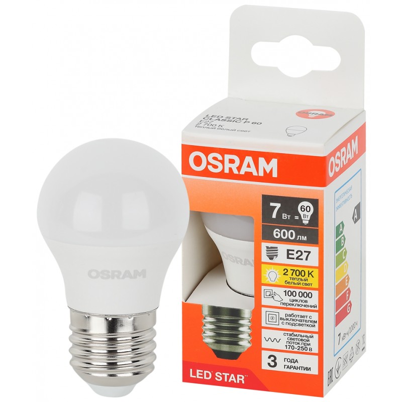 Лампа светодиодная OSRAM LED Star, 600лм, 7Вт (замена 60Вт), 2700К (теплый белый свет). Цоколь E27, колба P, угол пучка 180°. Исполнение колбы матовое, пластик.