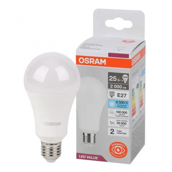Лампа светодиодная OSRAM LED Value, 2000лм, 25Вт (замена 200Вт), 6500К (холодный белый свет). Цоколь E27, колба A, угол пучка 180°. Исполнение колбы матовое, пластик. Напряжение питания 220-240В.