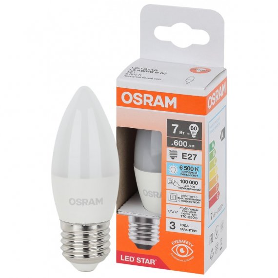 Лампа светодиодная OSRAM LED Star, 600лм, 7Вт (замена 60Вт), 6500К (холодный белый свет). Цоколь E27, колба B, угол пучка 200°. Исполнение колбы матовое, пластик.