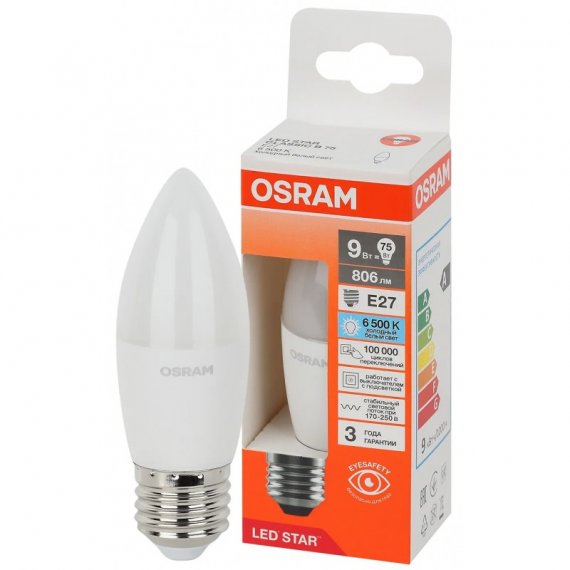 Представляем светодиодную лампу OSRAM LED Star мощностью 9 Вт, которая является идеальной заменой традиционным лампам накаливания. Эта лампа оснащена цоколем E27 и излучает холодный белый свет с цветовой температурой 6500 К. Благодаря своей форме свечи, она прекрасно подходит для использования в люстрах и других декоративных светильниках.