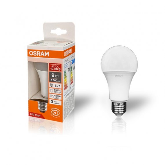 Светодиодная лампа OSRAM LED Star работает в диапазоне напряжений 12-36В и обладает мощностью всего 9Вт, обеспечивая при этом световой поток в 1000лм. Благодаря своей форме колбы A60 и цветовой температуре 4000K, она идеально подходит для общего освещения помещений. Лампа имеет гарантию 1 год.