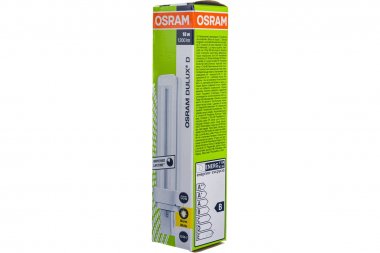 Компактная люминесцентная лампа неинтегрированная OSRAM DULUX D 18Вт с штырьковым одиночным цоколем G24D-2 и двухоборотной колбой.