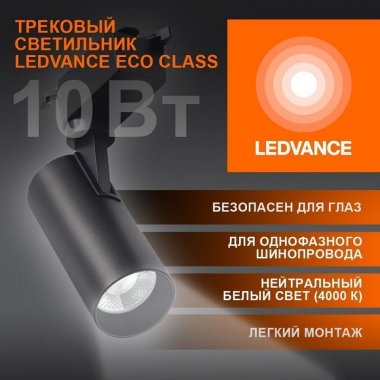 LEDVANCE ECO TRACKSP однофазный трековый светильник мощностью 10 Вт с углом рассеивания света 36 градусов и световым потоком 840 лм. Подходит для акцентной подсветки мебели, картин и создания общей атмосферы помещения.