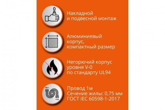 Провод 1м для удобства монтажа. Сечение жилы: 0,75 мм (ГОСТ IEC 60598-1-2017)