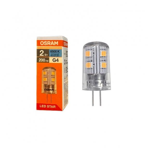 Лампа светодиодная OSRAM LED Star PIN, 200лм, 2Вт (замена 40Вт), 6500К (дневной белый свет). Цоколь G4, колба PIN, угол пучка 300°. Исполнение колбы прозрачное, пластик. Напряжение питания 220-240В.