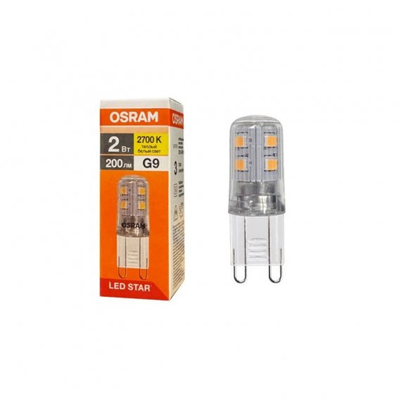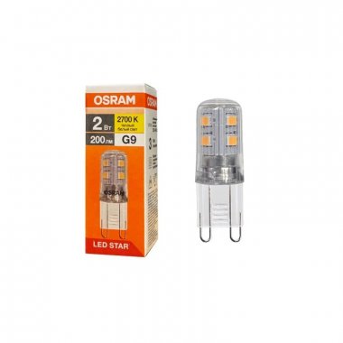 Лампа светодиодная OSRAM LED Star PIN, 200лм, 2Вт (замена 30Вт), 2700К (теплый белый свет). Цоколь G9, колба PIN, угол пучка 300°. Исполнение колбы прозрачное, пластик. Напряжение питания 220-240В.
