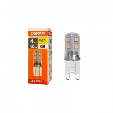 Лампа светодиодная OSRAM LED Star PIN, 450лм, 4Вт (замена 50Вт), 2700К (теплый белый свет). Цоколь G9, колба PIN, угол пучка 300°. Исполнение колбы прозрачное, пластик. Напряжение питания 220-240В.