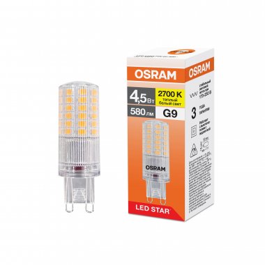 Миниатюрная капсульная лампа OSRAM серии LED Star с цоколем G9. Материал колбы - пластик, исполнение - прозрачное. Световой поток 580 люмен. Чаще всего ее можно увидеть в люстрах или подсветке мебели.