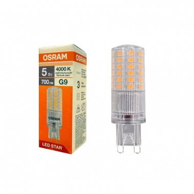 Лампа светодиодная OSRAM LED Star PIN 5W/840 G9, 700Лм, 5Вт (замена 70Вт), 4000К (нейтральный белый свет). Цоколь G9, колба PIN. Исполнение колбы прозрачное, пластик. Напряжение питания 170-250В.