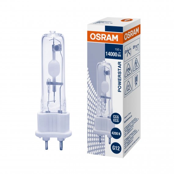 Металлогалогенная лампа OSRAM HCI-T мощностью 150Вт с керамической горелкой, прозрачной стекляной колбой и цоколем G12.