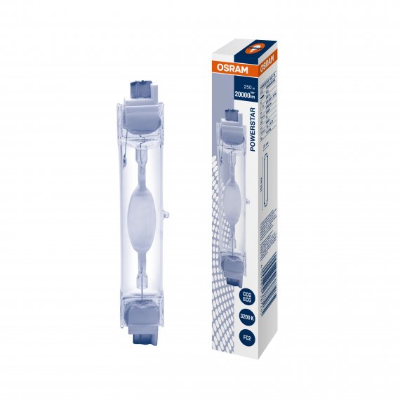 Металлогалогенная лампа OSRAM HQI-TS мощностью 250Вт с кварцевой горелкой, прозрачной стекляной колбой и цоколем FC2.