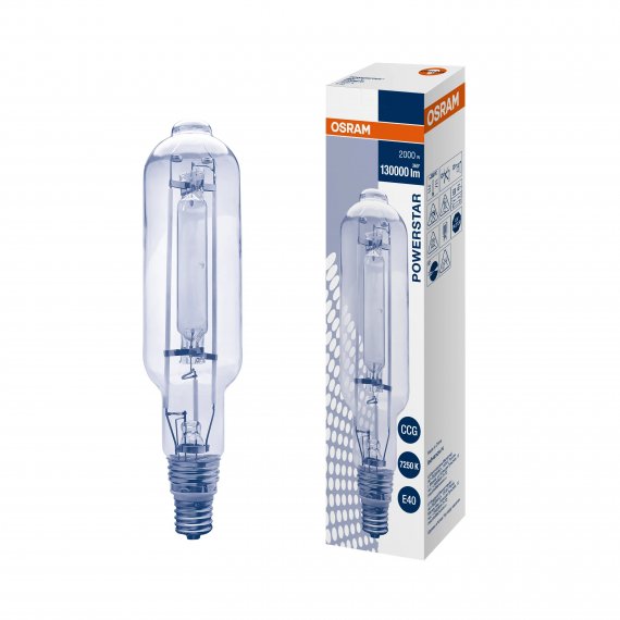 Металлогалогенная лампа OSRAM HQI-T мощностью 2000Вт с кварцевой горелкой, прозрачной стекляной колбой и цоколем E40.