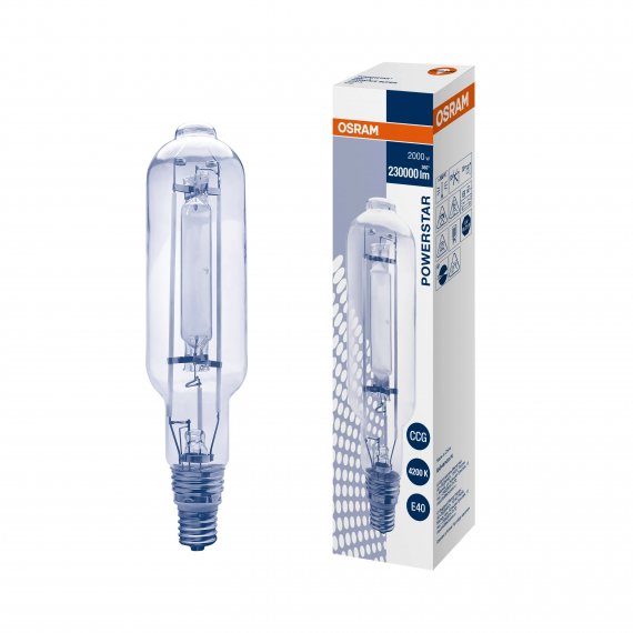 Металлогалогенная лампа OSRAM HQI-T мощностью 2000 Вт с кварцевой горелкой, прозрачной стекляной колбой и цоколем Е40.