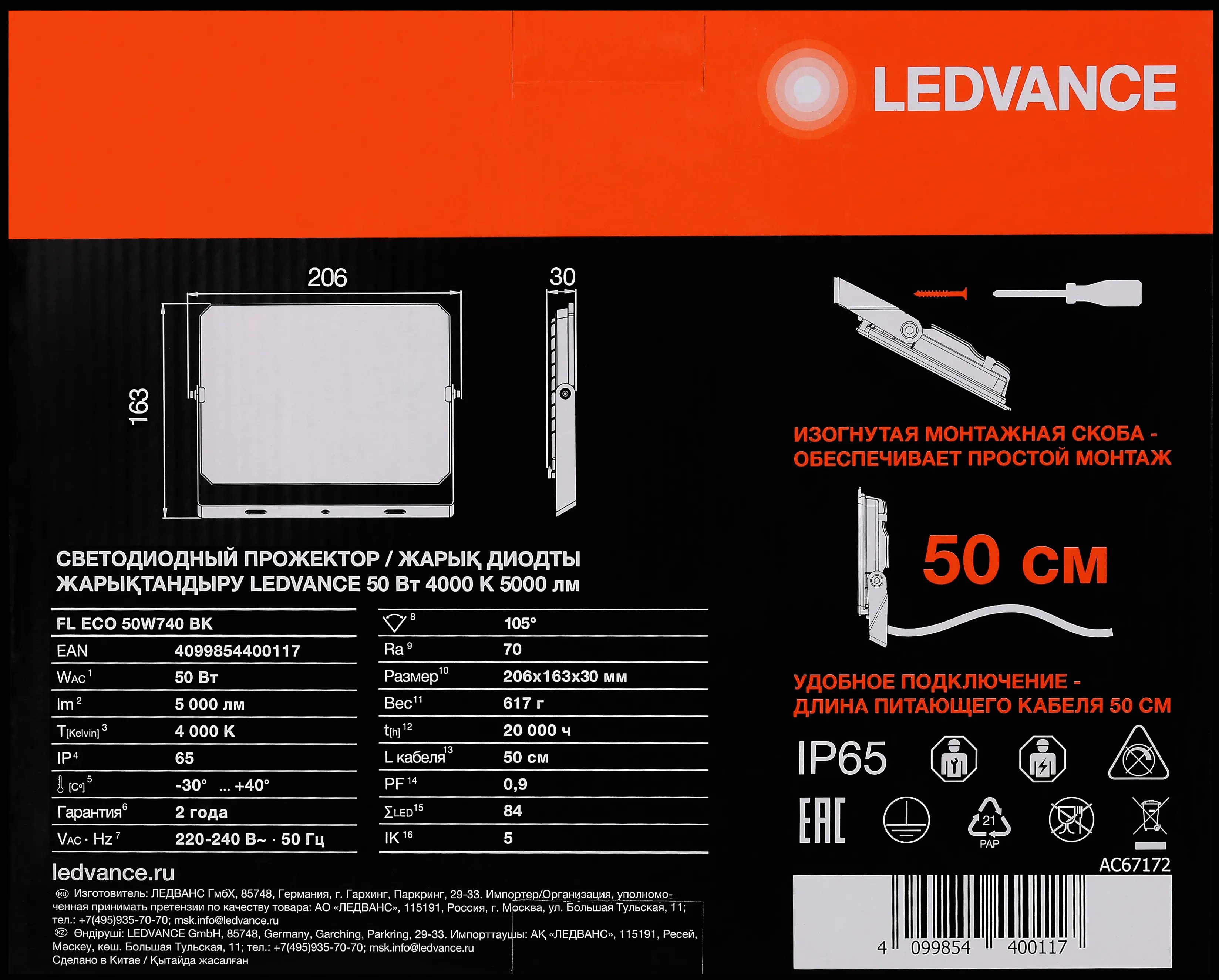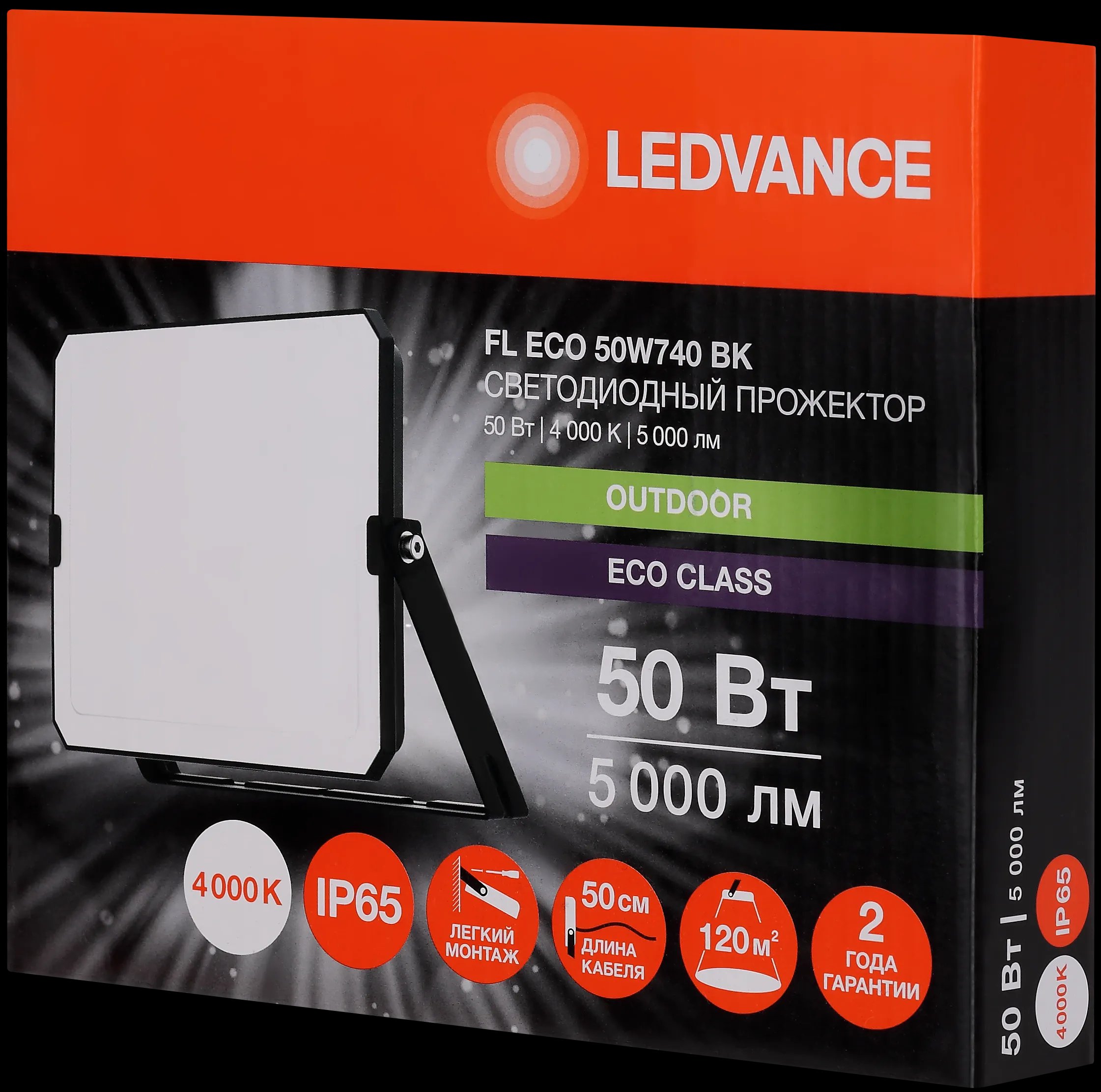 Прожектор светодиодный ДО-50Вт, 4000К IP65, черный LEDVANCE, провод 50 см